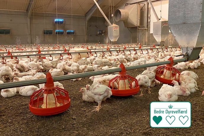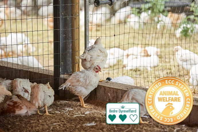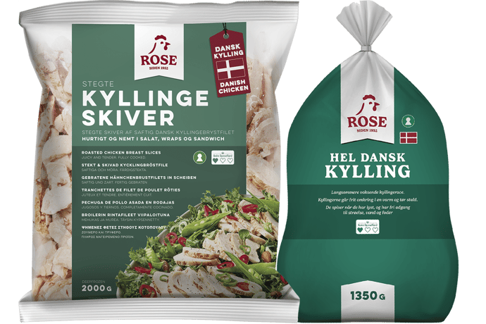 ROSE 1-hjertede kyllinger er langsommere voksende end vores konventionelle kyllinger og har mere plads i stalden. Derfor bærer de det officielle danske dyrevelfærdsmærke med 1 hjerte.